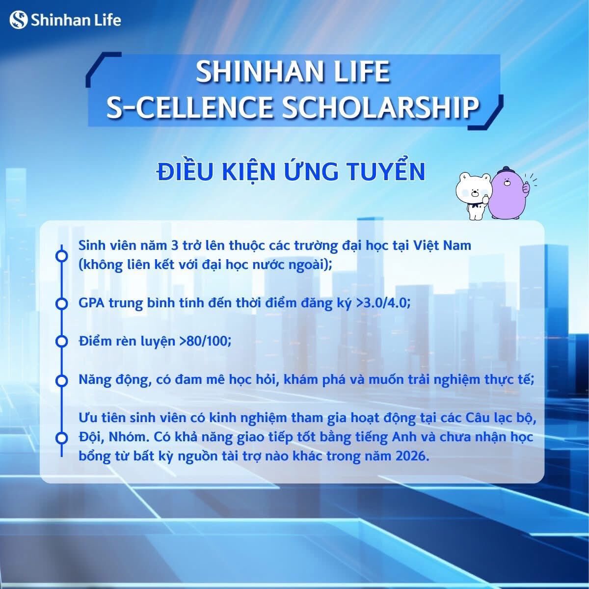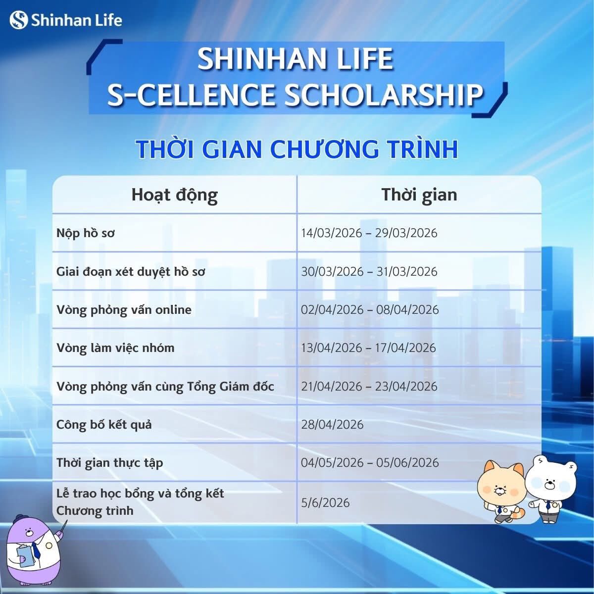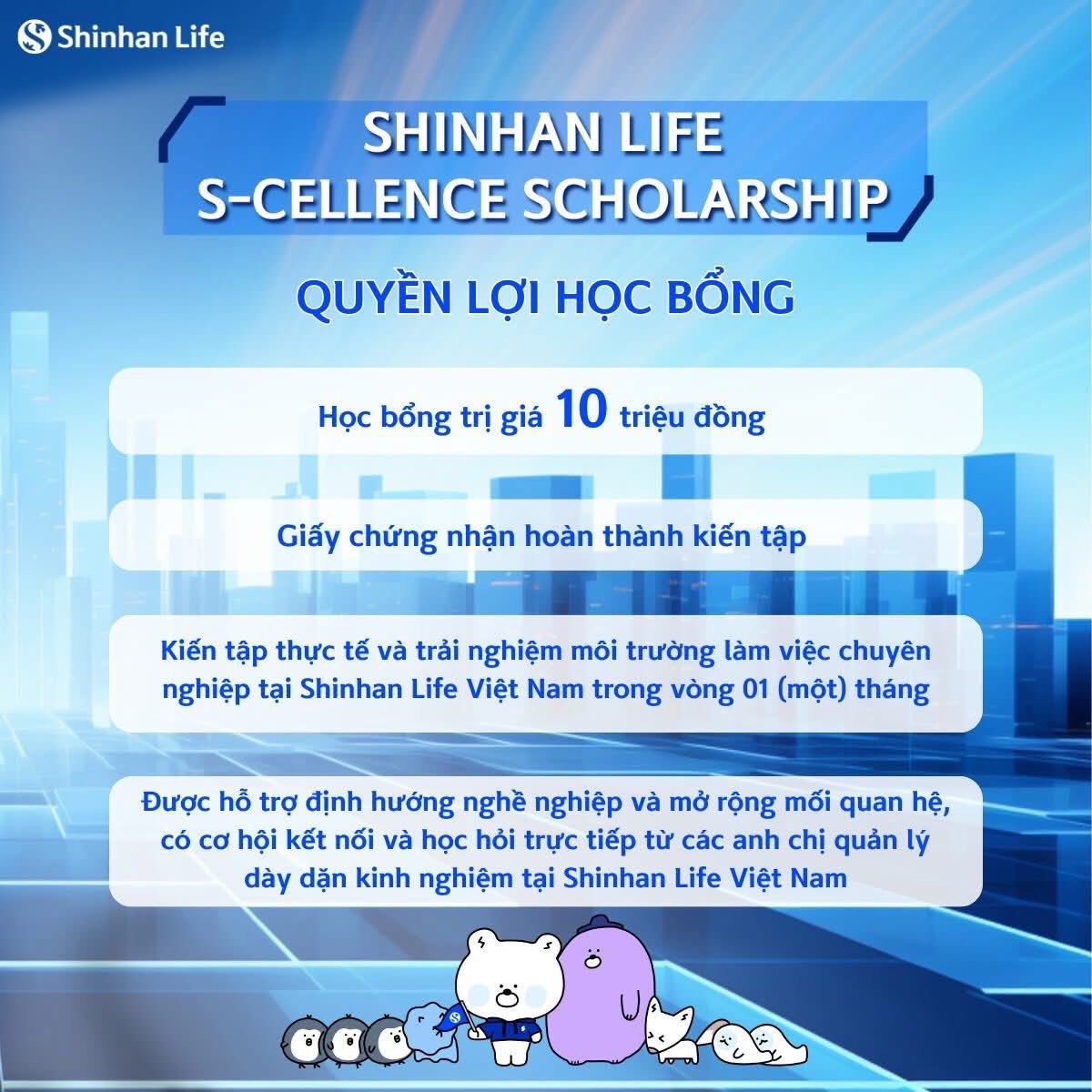 Xét cấp học bổng "SHINHAN LIFE S-CELLENCE SCHOLARSHIP" năm 2026Được đăng: Thứ ba, 17 Tháng 3 2026 01:30 Thông báo triển khai (File pdf) Chương trình học bổng (File word) Trang trước Trang sau