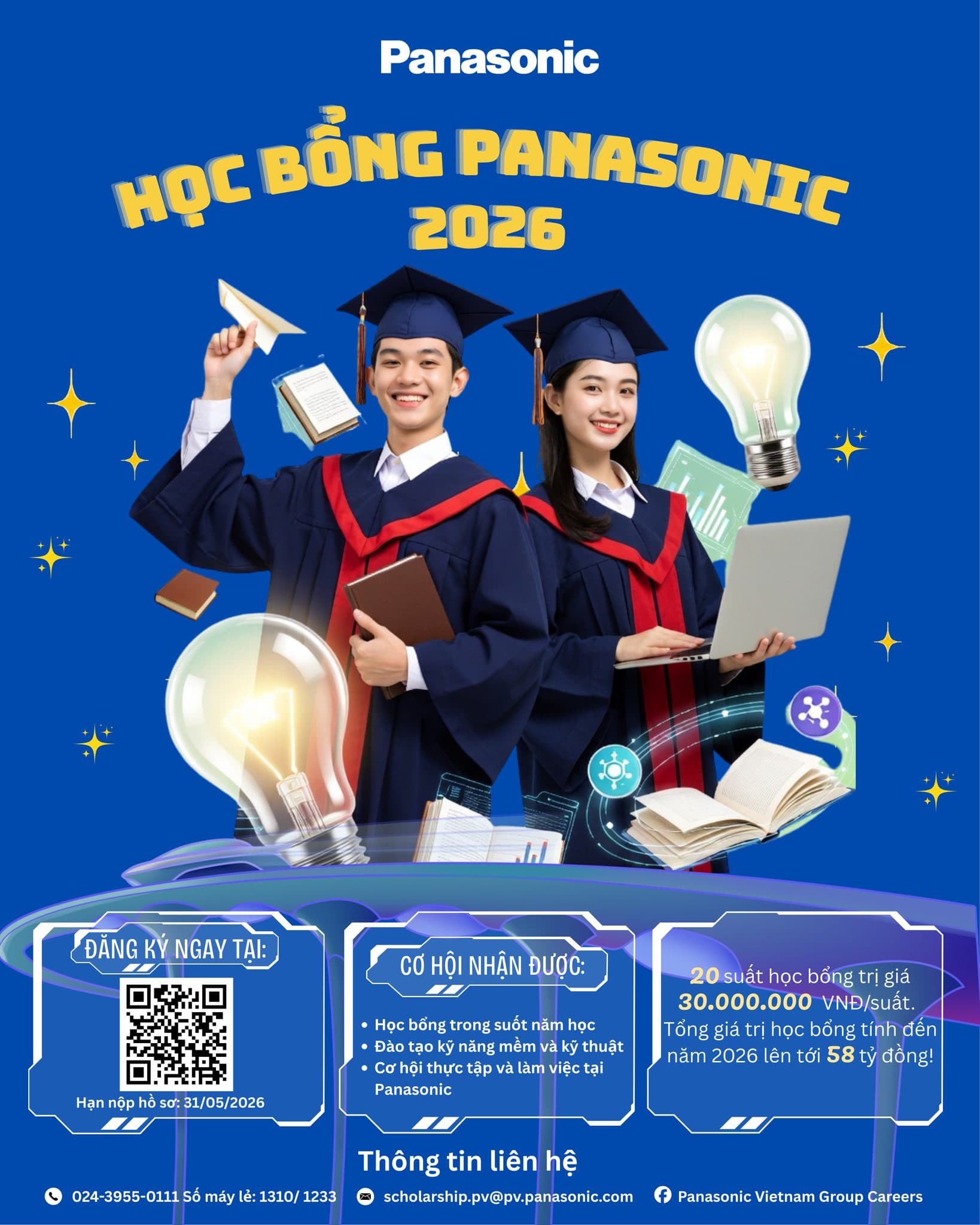 Xét cấp học bổng bậc đại học Panasonic năm 2026Được đăng: Thứ sáu, 03 Tháng 4 2026 07:32 Thông báo học bổng (File word) Thông báo triển khai học bổng (File pdf) Trang trước Trang sau