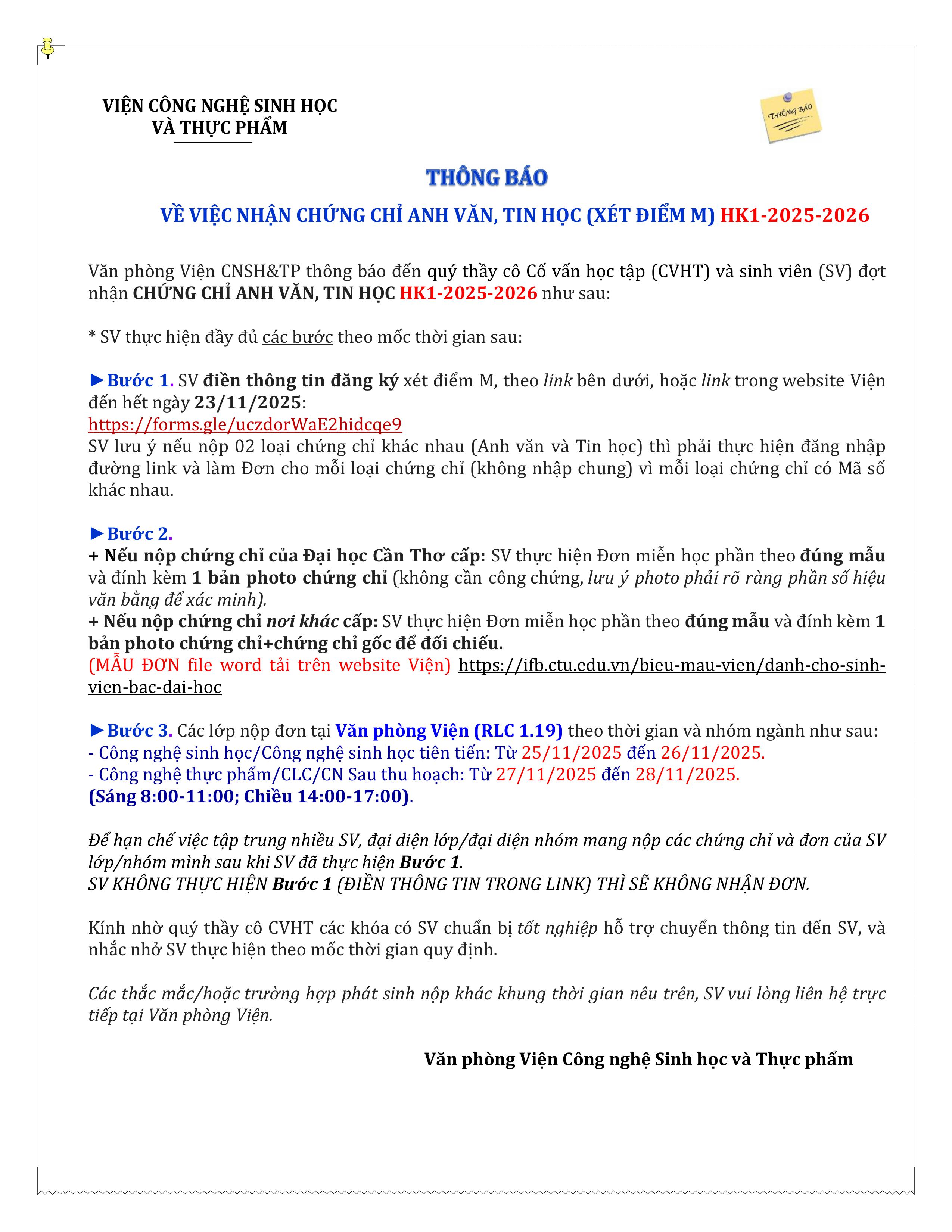 Viện CNSH&TP thông báo đợt nhận CHỨNG CHỈ ANH VĂN, TIN HỌC HK1-2025-2026. SV thực hiện theo hướng dẫn trong thông báo đính kèm.