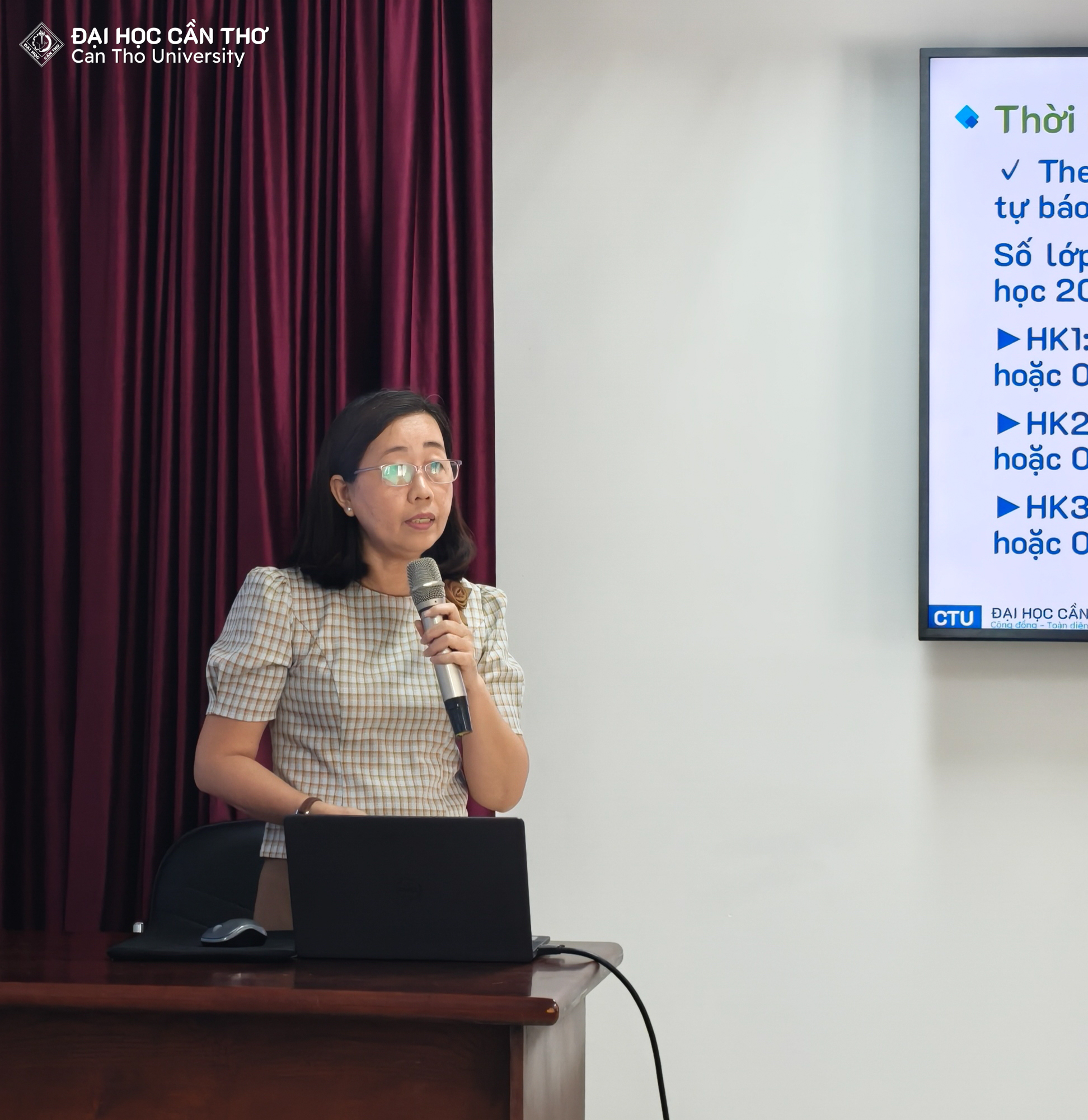 Cô Lý Thị Bích Thuỷ Trợ lý đào tạo trình bày một số lưu ý trong hoạt động giảng dạy và công tác cố vấn học tập, công tác sinh viên